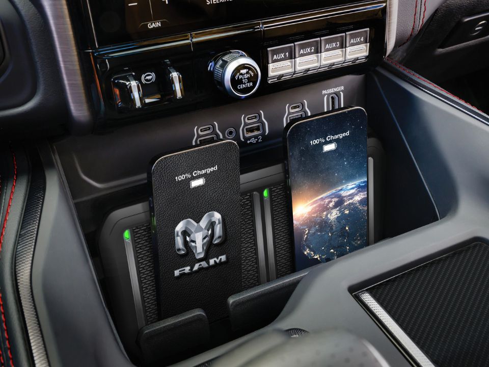 Puertas adentro, esta Ram 1500 SRT cuenta con un buen nivel de equipamiento. En este sentido, la conectividad corre a cargo del sistema Uconnect 5 con pantalla táctil de 14.5 pulgadas, clúster digital de 12.3 pulgadas, head-up display y cámaras 360°. Apple CarPlay y Android Auto son inalámbricos.